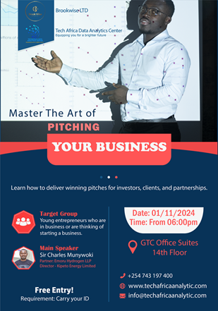 Pitching Your Business Targeted young entrepreneurs who are in business or thinking to start a business to learn how to deliver winning pitches for investors, clients, and partnerships. Watch On YouTube Share: Event Information : Title: Pitching Your Business Venue: GTC Office Suites, 14th Floor View When: November 01, 2024 | 1800H CALL FOR CONSULTATION +254725316747