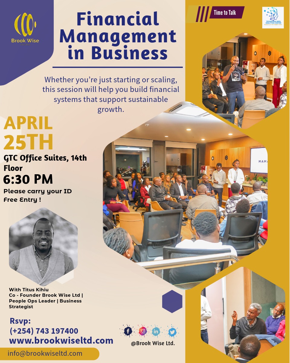 Financial Management in Business Whether you are just starting or scaling, this session will help you build financial systems that support sustainable growth. Watch On YouTube Photos of Event View photos Share: Event Information : Title: Financial Management in Business Venue: GTC Office Suites, 14th Floor View When: April 25, 2025 | 1830H CALL FOR CONSULTATION +254725316747
