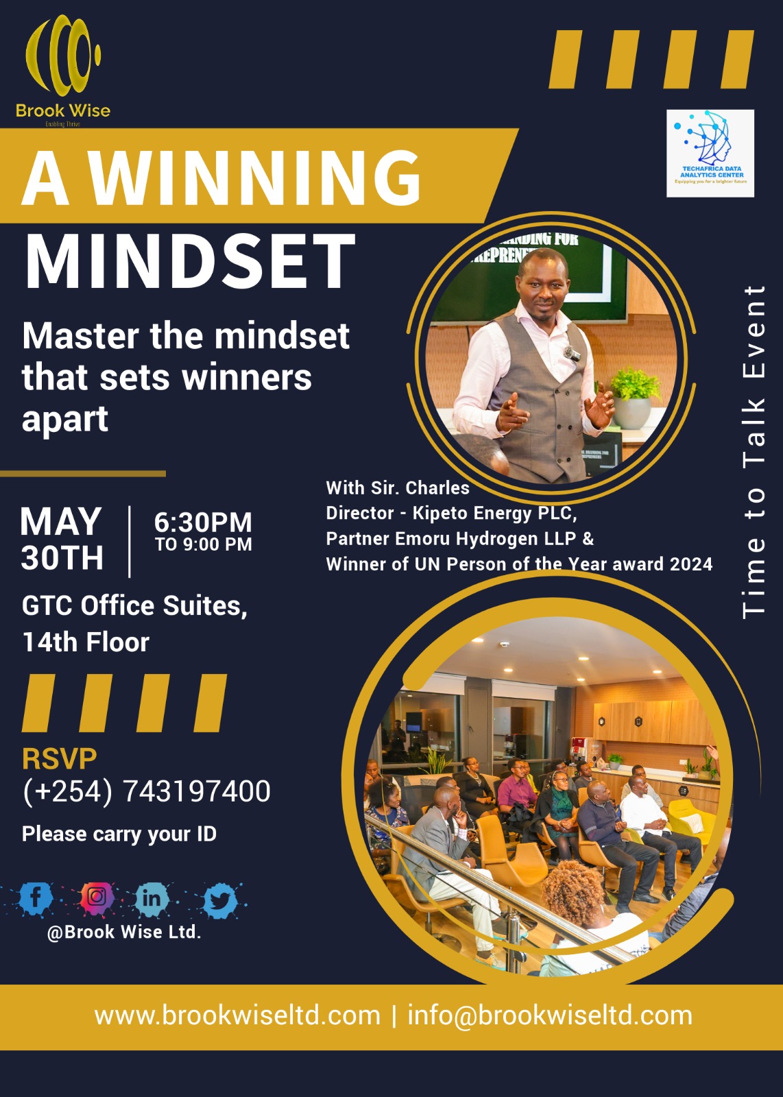A Winning Mindset Master the mindset that sets winners apart Photos of Event View photos Share: Event Information : Title: A Winning Mindset Venue: GTC Office Suites, 14th Floor View When: May 30, 2025 | 1830H CALL FOR CONSULTATION +254725316747